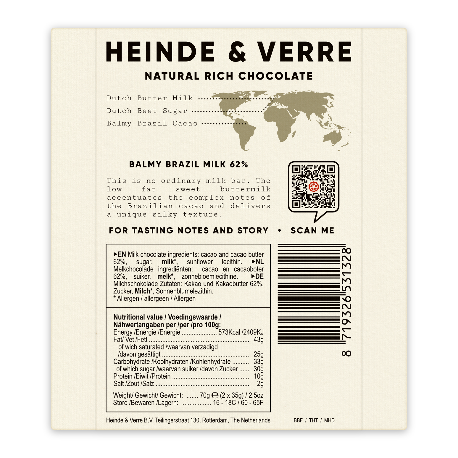 Dit is geen gewone melkchocolade. De magere zoete karnemelk accentueert de complexe tonen en geeft een unieke zijdezachte textuur aan biologische Braziliaanse cacao. Een perfect huwelijk voor het multi-roast-profiel dat we aan deze cacao geven. Dit betekent dat we batches van deze cacaobonen op verschillende manieren roosteren en ze vervolgens opnieuw mengen tijdens het malen en coachen. Dit draagt bij aan de complexiteit en een veelvoud aan smaken in de chocolade.